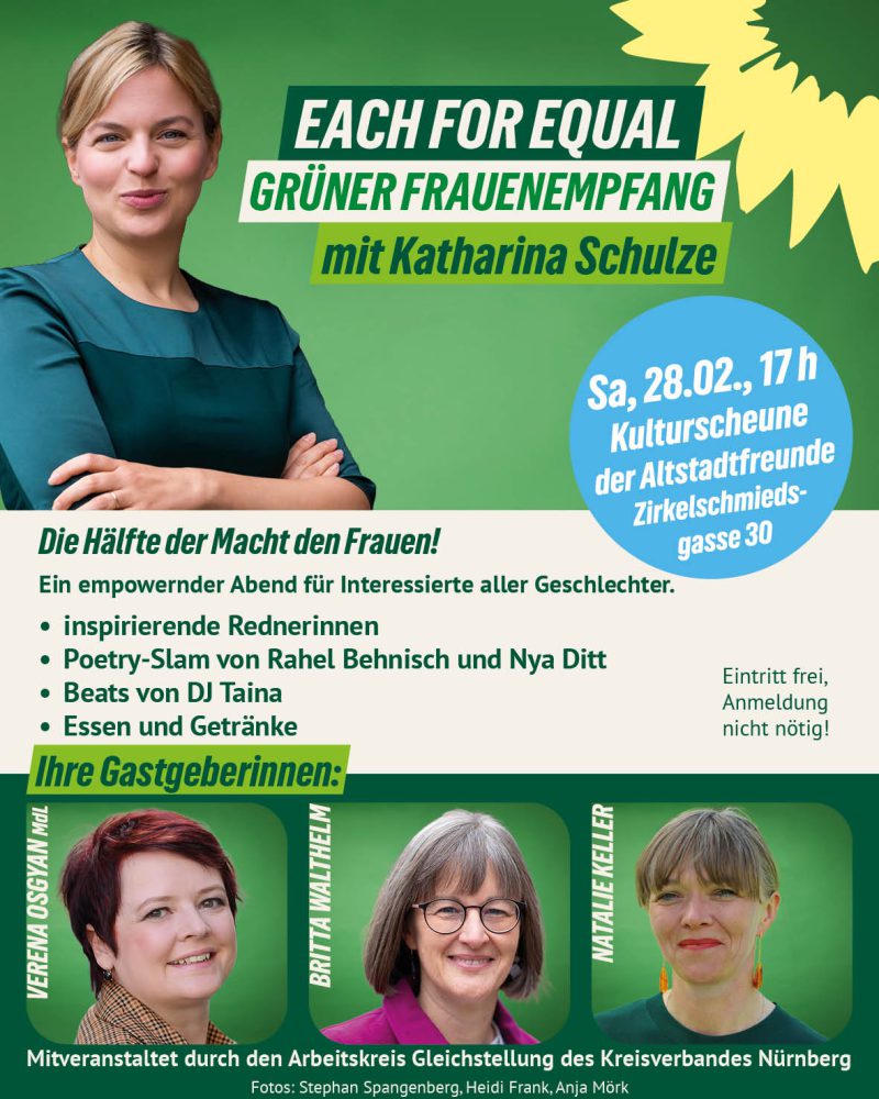 Stadträtin Natalie Keller, stellvertretende Fraktionsvorsitzende der Grünen Landtagsfraktion Verena Osgyan, der AK Gleichstellung sowie der Grüne Kreisverband Nürnberg laden alle Interessierten (alle Geschlechter) am 28. Februar 2026 ab 17.00 Uhr zum Grünen Frauenempfang ein mit der Nürnberger OB-Kandidatin Britta Walthelm und der Fraktionsvorsitzenden im Bayerischen Landtag, Katharina Schulze.